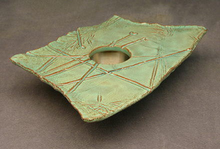 slab built with impressed texture, glazed white earthenware and metal cup with pin frog, 2"x8"x6"