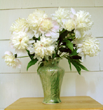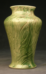 Fan vase: thrown and coil built to create oval opening, relief texture (created by painting shellac on greenware and then sponging negative areas to be recessed), white stoneware, oribe glaze, cone 10 reduction firing, 11"x7"x7"