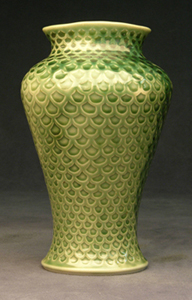 thrown and coil built to create oval opening, relief texture (created by painting shellac on greenware and then sponging negative areas to be recessed), white stoneware, oribe glaze, cone 10 reduction firing, 11"x7"x7"