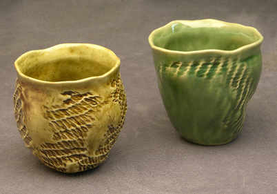 pinch pot with impressed texture, white stoneware, ash and oribe glaze, cone 10 reduction firing, 4"x2"x2"