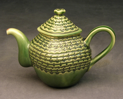 coil built with impressed texture, white stoneware, oribe glaze, cone 10 reduction firing, 7"x9"x4"