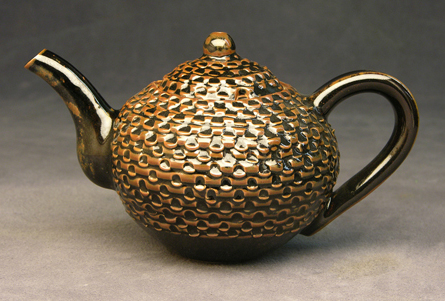 coil built with impressed texture, white stoneware, tenmuku glaze, cone 10 reduction firing, 6 "x8"x5"